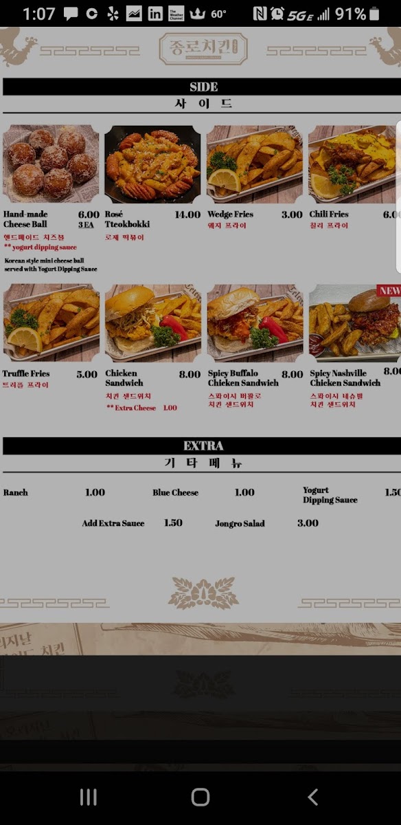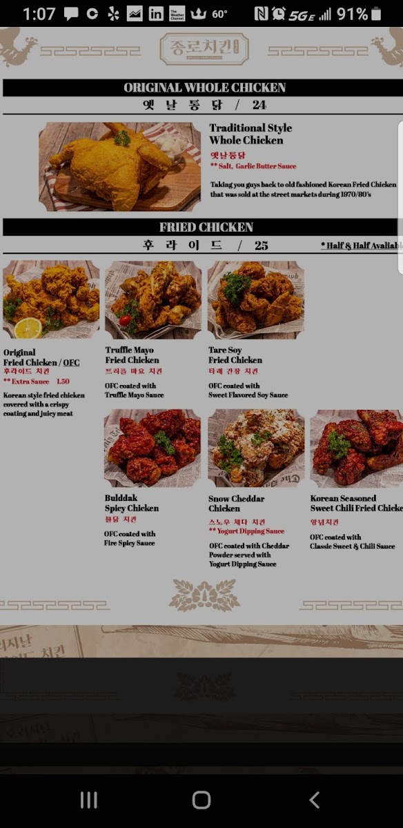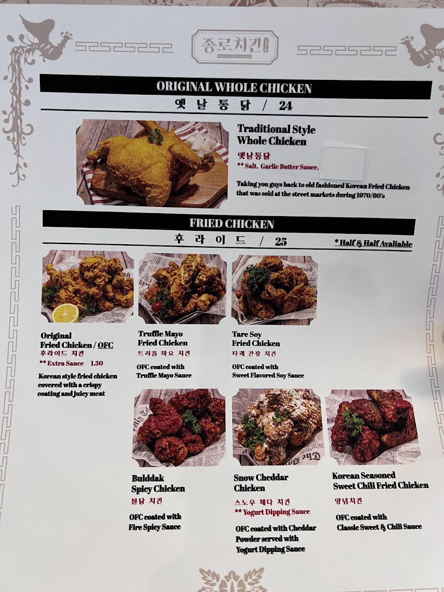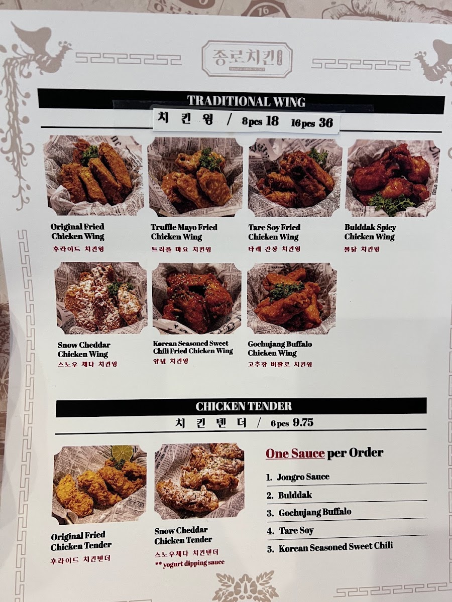 The menu at Jongro Chicken offers a focused selection of Korean fried chicken and classic sides, reflecting a simple yet satisfying approach to casual dining. With a range of wing flavors—from rich and creamy truffle mayo to bold and spicy Nashville hot—there’s a something for those seeking familiar comfort with a Korean twist.